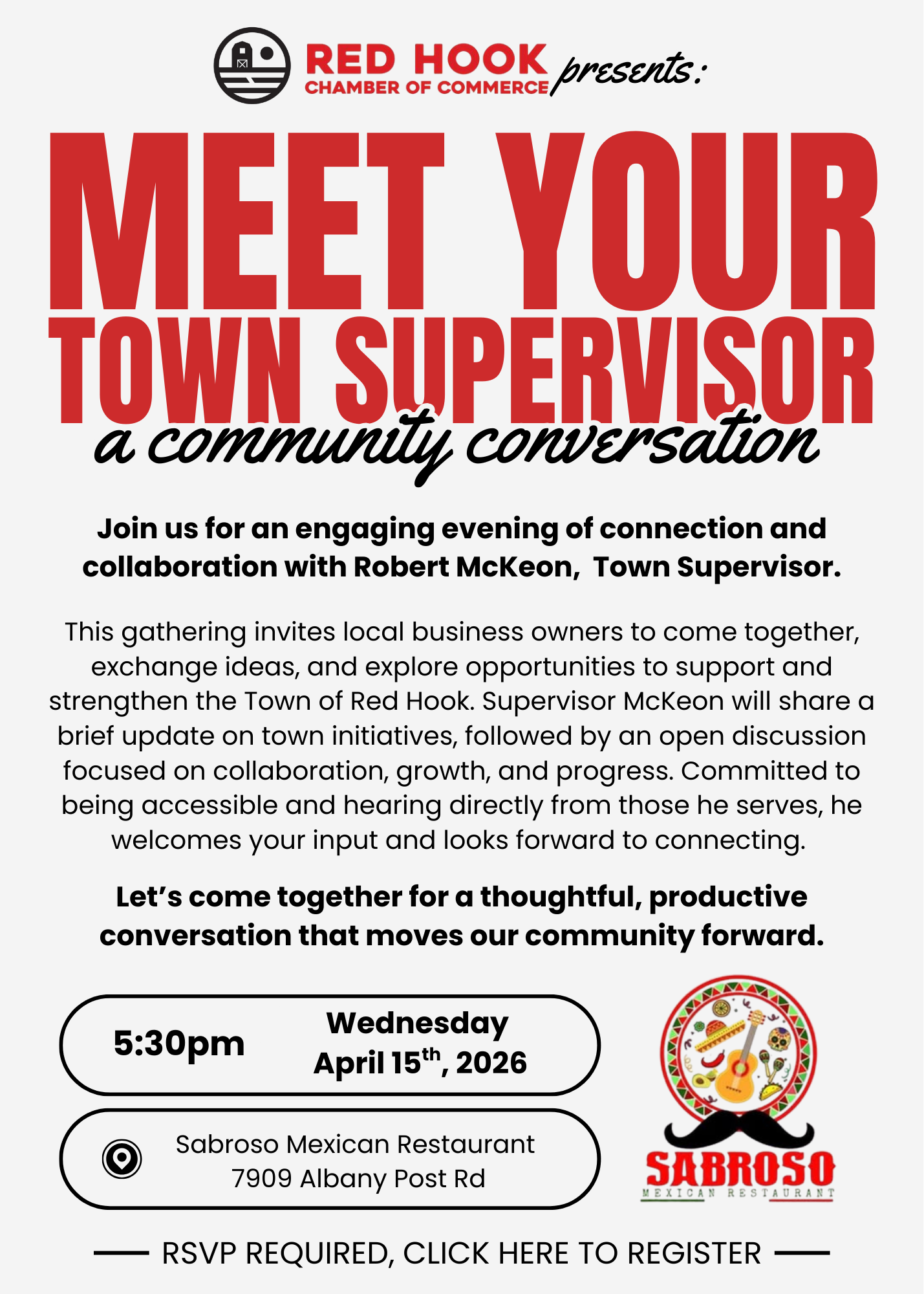 Meet Your Town Supervisor Wednesday, April 15, 2026 5:30 PM 7:30 PM Sabroso 7909 Albany post road Red Hook, NY 12571 USA (map) Google Calendar ICS