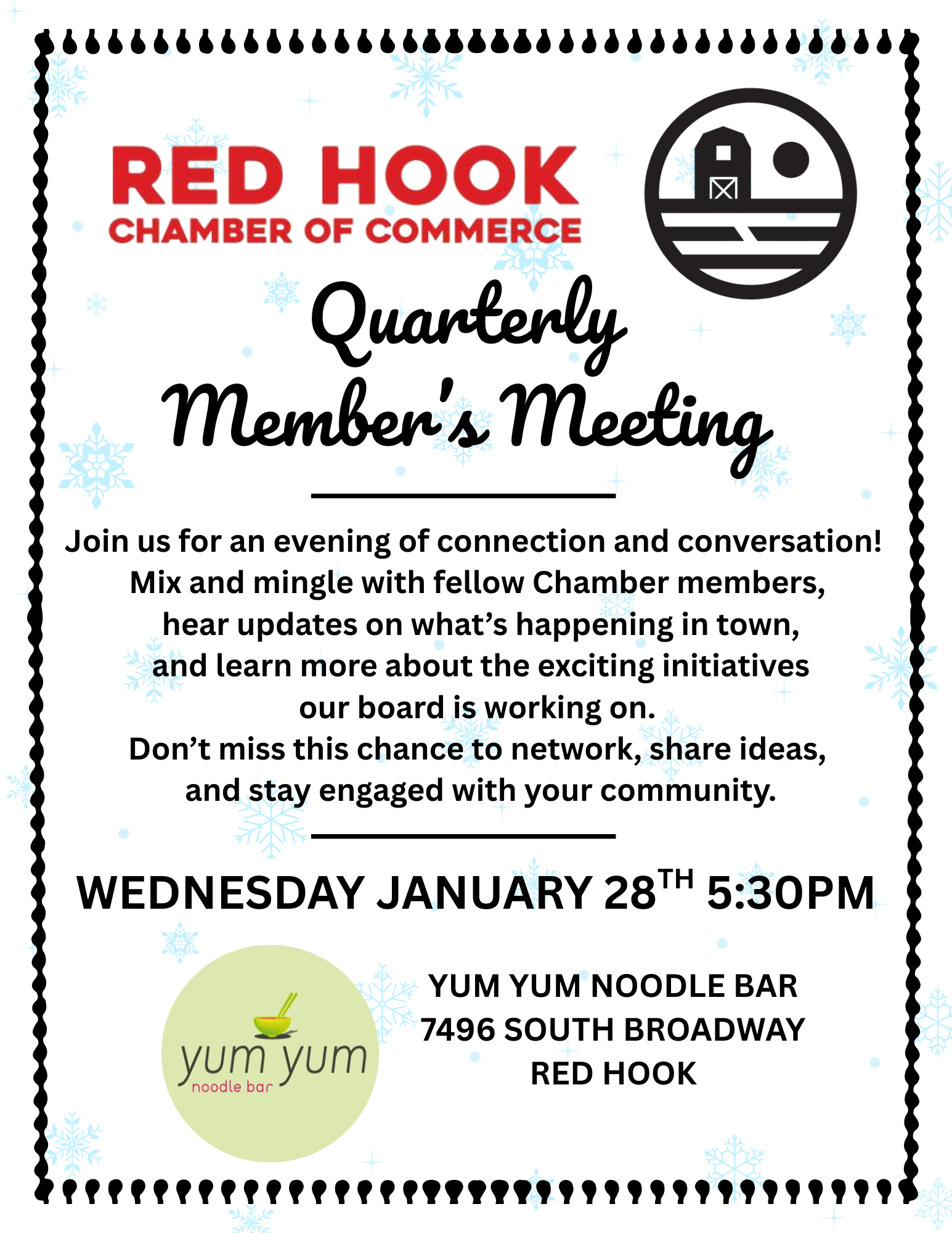 Quarterly Member's Meeting Wednesday, January 28, 2026 5:30 PM 7:00 PM Yum Yum Noodle Bar 7496 South Broadway Red Hook Red Hook, NY 12571 USA (map) Google Calendar ICS